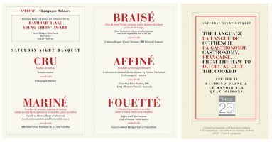 Sponsored by – Raymond Blanc and the team at Le Manoir aux Quat’Saisons for designing and preparing our meal and for donating cuttings from the Manoir’s gardens. Max Barber, Cathy Kaufman, Ben Keeley, Grace O’Sullivan and Daniel Penn for helping the prep team at Le Manoir. Ruinart for generously donating their champagne. O. W. Loeb, as well as to Domaine de la Croix Senaillet and Château Pesquié for the wines. Patricia Michelson and La Fromagerie for the French cheeses, especially selected as a tribute to Raymond Blanc. Wychwood Brewery for Green Goblin Oak Aged English Cider (brewed in Oxfordshire). Imperial Caviar UK, M Newitt & Sons and Mash Purveyors, Ltd. for generous reductions on caviar, ox cheek and fruit & vegetables, respectively.